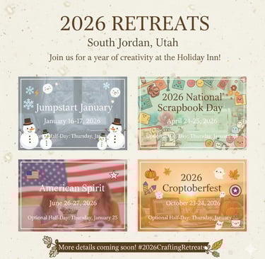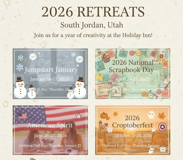 Plan ahead for an amazing year of crafting! Join me for my 2026 retreats, offering dedicated creative time and fun in South Jordan, Utah. Each retreat includes an optional Thursday half-day to maximize your experience.